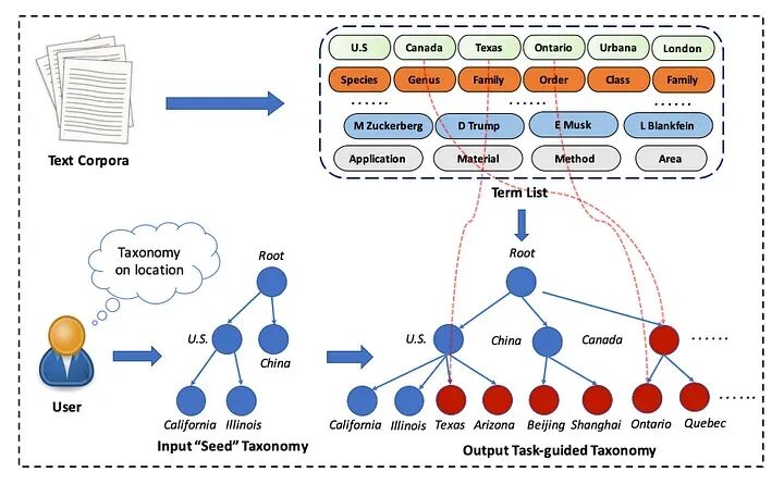 任务引导的分类法构建。用户提供一个“种子”分类法树作为任务指导,我们将从原始文本语料库中提取关键术语并自动生成所需的分类法。