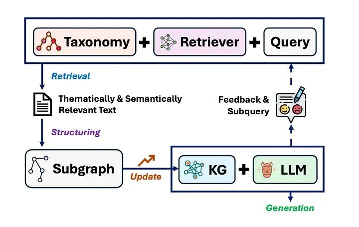 迭代循环: 这种方法使用迭代循环,其中分类法增强的检索器找到相关文档,然后立即将其结构化为子图以更新特定于查询的 KG。LLM 使用这个结构化 KG 来回答查询,如果需要,它会生成一个集中的子查询来启动一个新的、精炼的检索循环。