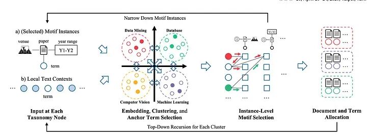 TaxoGen 将相关术语组合成一个主题,使分类法更具信息性。它首先将术语转换为嵌入以捕获其含义,然后使用一种特殊类型的聚类逐步将广义主题分解为更具体的主题,同时确保通用术语保持在较高层次,而特定术语深入。为了在较小主题中对术语进行更精细的区分,TaxoGen 仅使用与该主题相关的文档学习新的嵌入,从而能够分离细微的差异。该方法是完全自动化的,并创建比以前方法更清晰、更有用的分类法,帮助用户和系统更好地导航和理解大型文本数据集。