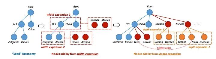 分类法构建从一个基本结构(称为“种子”)开始。不同的方法以广度和深度扩展这个种子,然后调整整体结构。