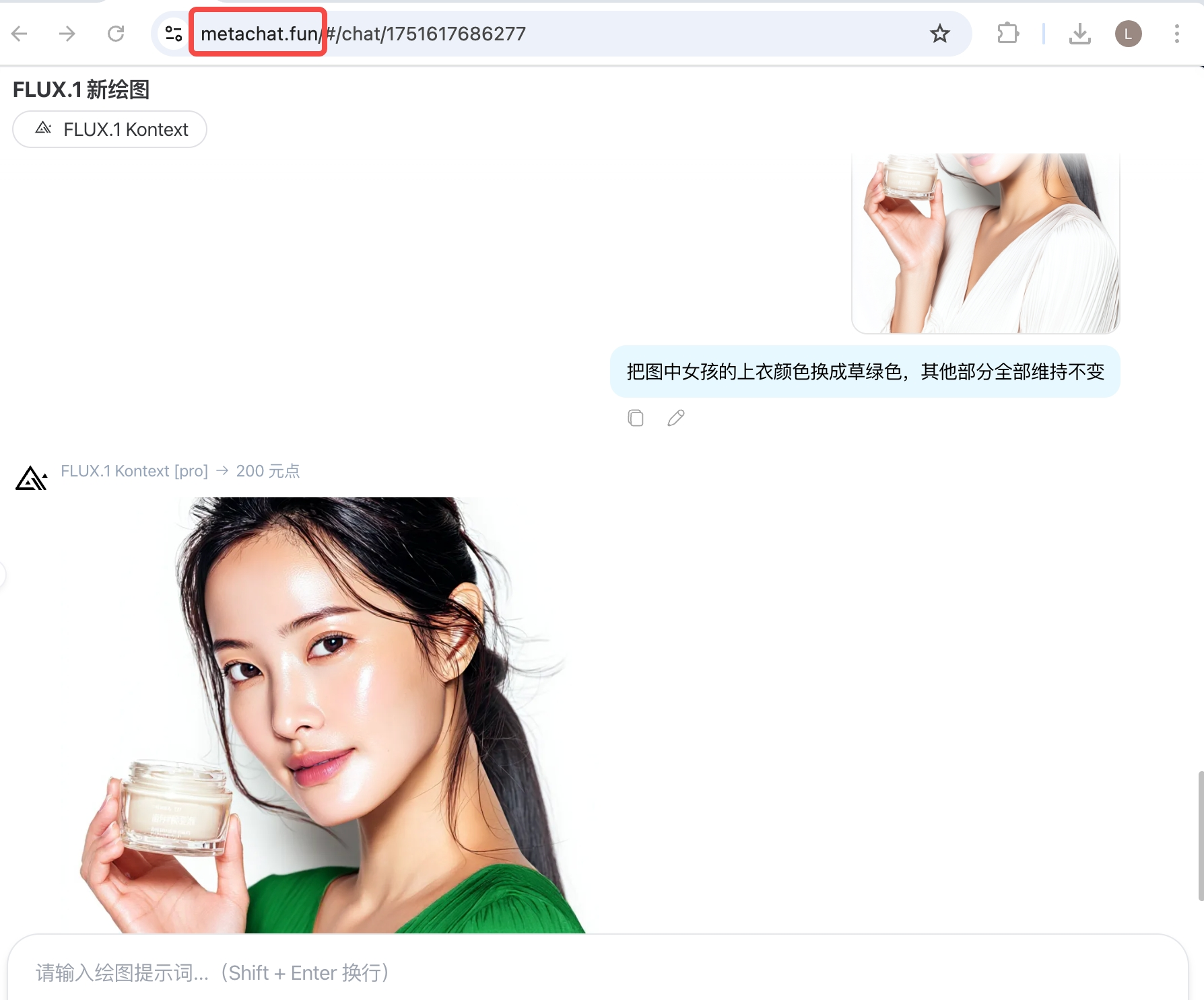 打开一站式AI创作服务平台MetaChat(https://metachat.fun ),然后新建对话,选择 Flux,然后传图,写提示词即可。