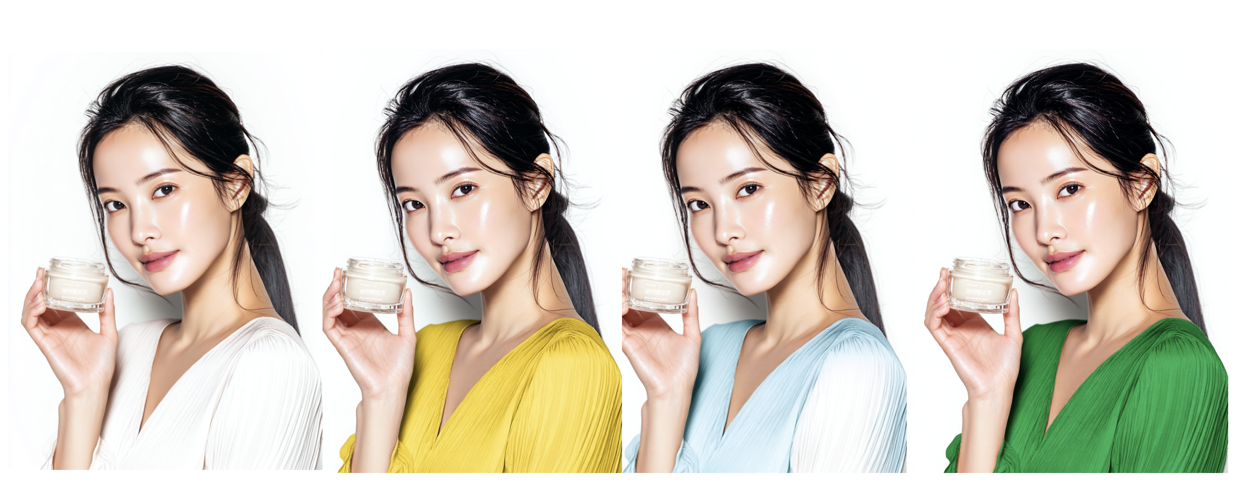 “把图中女孩的上衣的颜色换成xx色,其他部分全部维持不变” ,原图是白衣服,分别试了鹅黄色,天蓝色,草绿色。得到下面一组图片,怎么样,除了颜色,其他的服装面料细节,人物特征,都很好的保持住了。