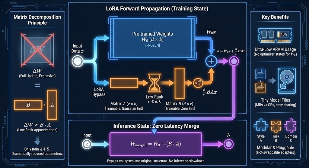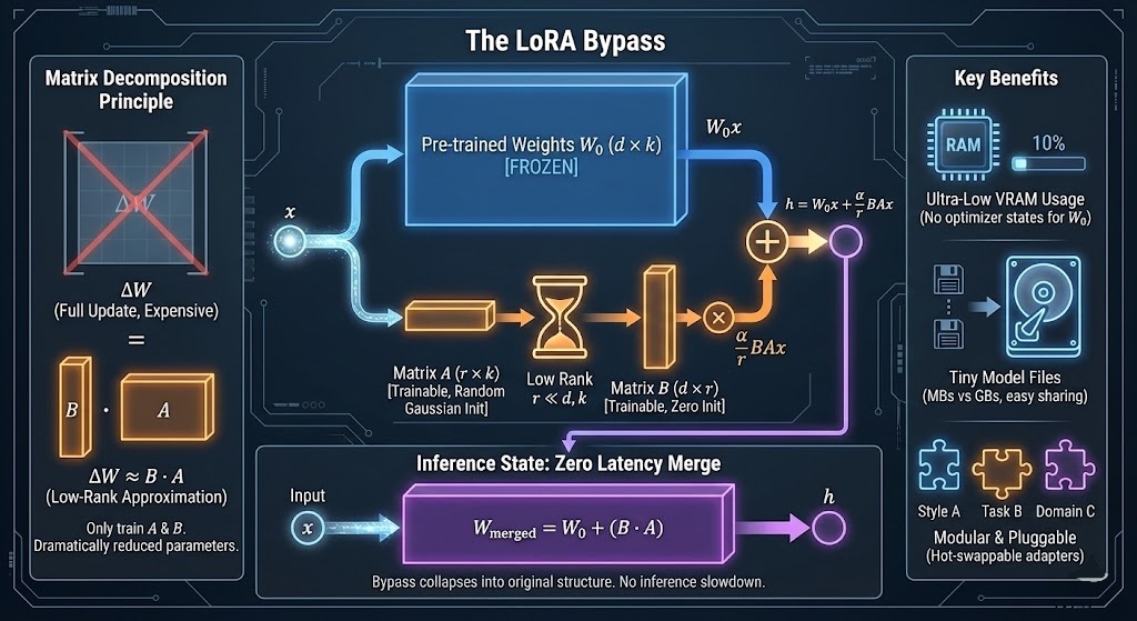[Image Concept]: 想象一个“旁路”结构。左边是巨大的原始模型(冻结),右边搭了一座很窄的桥(LoRA Adapter)。数据同时流过两边,最后汇合。