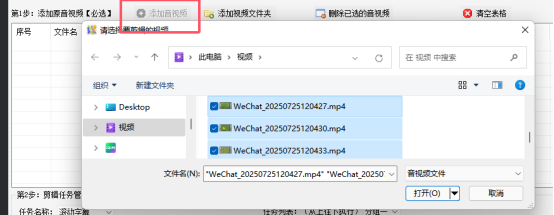 2.点击“添加音视频”,选择你想要剪辑的多个视频文件。