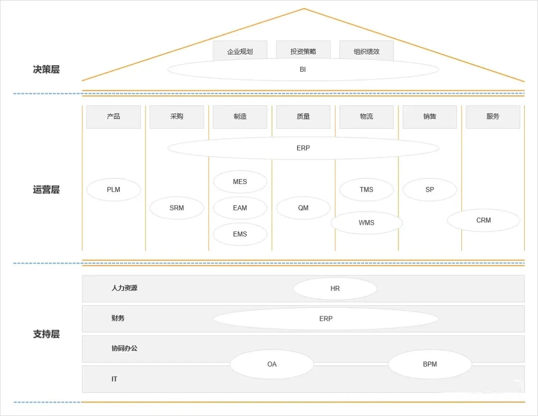 在企业信息化数字化过程中,我们常会遇到诸多系统,如 ERP、MES、SCM、SRM、PLM、CRM、QMS、WMS、BI、APS、SCADA、HR、BPM、TMS、EAM、EMS。这些系统究竟是什么?具备哪些功能和作用?它们之间又存在怎样的关系?