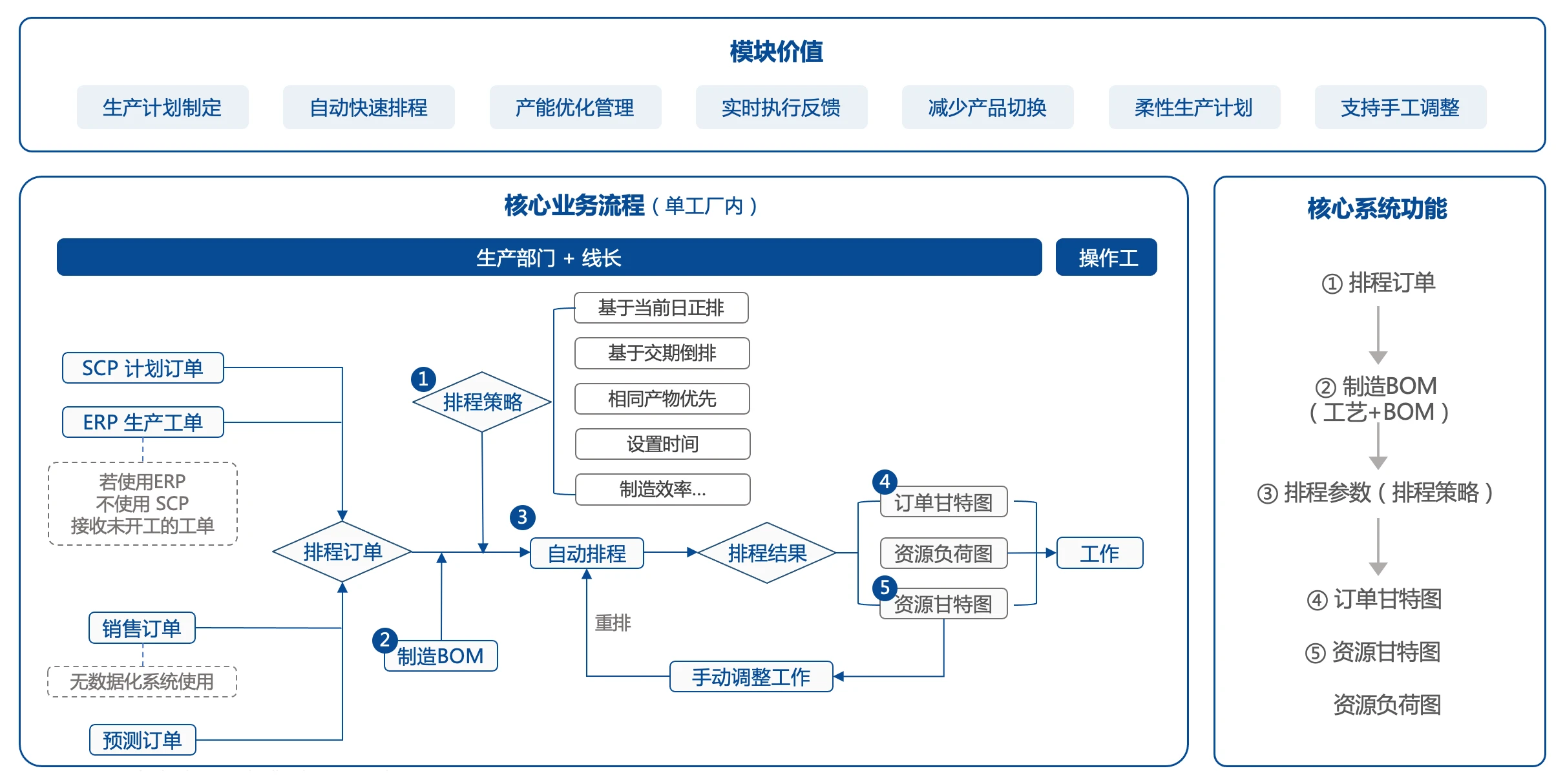 解释:提供详细生产计划和排程功能,优化生产效率与交付性能。