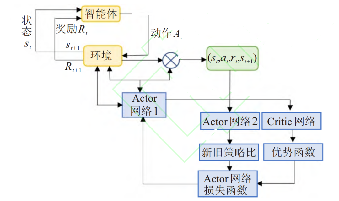 PPO 是一种基于概率策略优化更新的代表算法, 具有较好的训练稳定性和样本训练效率. 其核心思想是通过计算新旧策略的概率比, 结合优势函数来优化策略, 并且在更新过程中通过裁剪机制防止过大的更新幅度, 如图所示