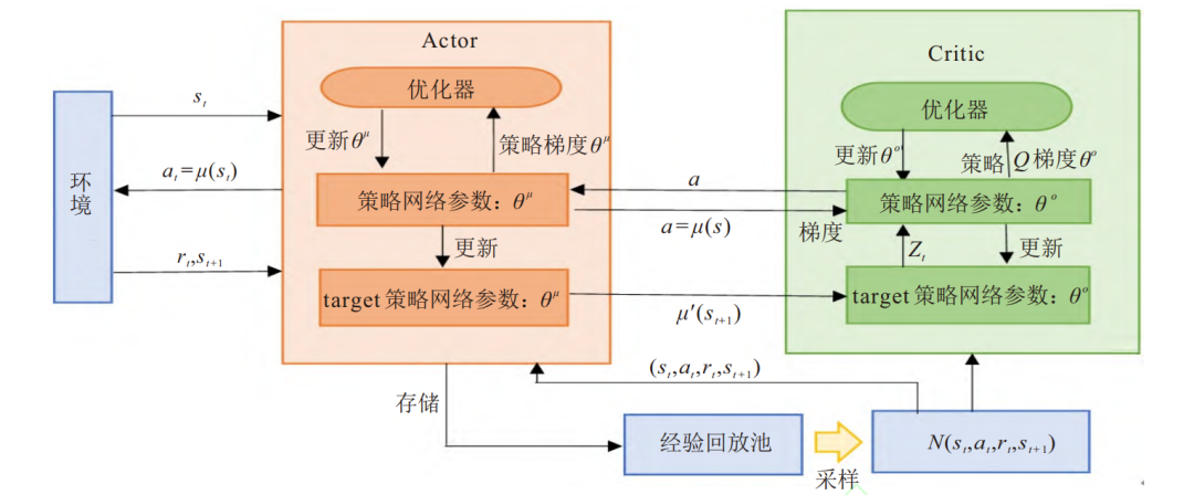 DDPG 是一种基于确定性策略梯度更新的代表算法, 通过分别训练 Actor 和 Critic 网络来优化策略与估值函数, 能够精细调整控制参数, 如车辆的加速、刹车力度等. 该方法的策略更新流程如图所示