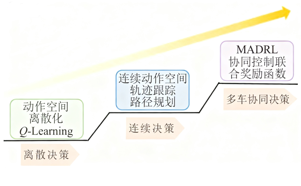 自动驾驶行为决策技术的智能化进程与DRL 的发展呈现出高度耦合的态势. DRL在自动驾驶中 的应用经历了从离散决策问题到连续动作决策, 再 到多智能体协同决策的逐步演进, 如图所示.