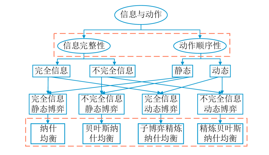 根据参与对象之间是否存在合作性的约束力协议,能够将博弈划分为合作博 弈与非合作博弈两类。此外,基于参与对象的动作顺序性及信息完整性又可以将 非合作博弈划分为完全信息静态博弈、完全信息动态博弈、不完全信息静态博弈 与不完全信息动态博弈等四种博弈,而这四种博弈分别对应纳什均衡、子博弈精 炼纳什均衡、贝叶斯纳什均衡以及精炼贝叶斯纳什均衡等四种均衡
