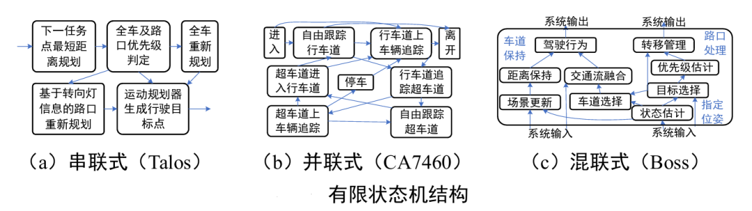 基于规则行为决策最经典的模型为有限状态机 (Finite State Machine,FSM)模型。该模型本质上是一个离散输入输出的系统,在有 限的状态集合内,通过当前状态作为输入信息,针对不同状态依据安全和舒适的原则 产生有关行动。依据各状态之间的转移关系,可将限状态机分为以 Talos 为代表 的串联式、以 Junior、Bertha、红旗 CA7460为代表的并联式和以智能先锋II、Bossx、Odin为代表的混联式三种结构
