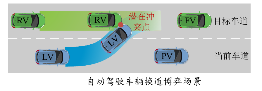 事物变化中难免存在冲突与合作,可借助博弈论分析解决,这一逻辑适用于自动驾驶换道场景。换道涉及车道变更,具有时间与空间动态特性,当前车道换道车辆(LV)受前车(PV)速度约束产生换道意图时,易与目标车道后车(RV)形成速度竞争,进而构成博弈关系。