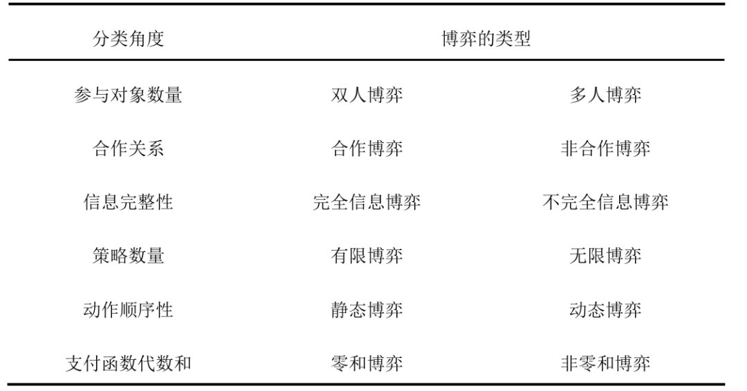 在现有的学科领域中存在多种博弈,从不同的角度可以将博弈分为不同的种 类。通常选取参与对象数量、合作关系、信息完整性以及动作顺序性等角度进行 博弈的类别划分,分类的结果如表