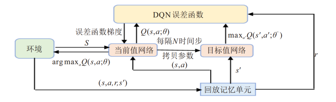 DQN 是基于值函数的策略更新代表算法, 通过更新 Q 值函数来选择最优动作. 该方法的策略更新流程如图所示