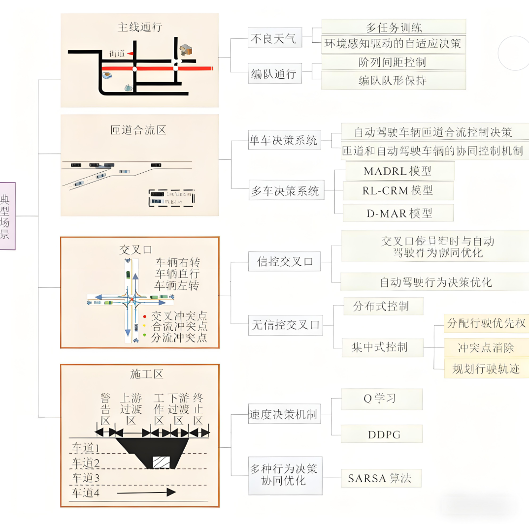 现有方案多集中于特定道路场景,对乡村道路等 “长尾问题” 场景关注较少;研究重点除跟驰、换道等基本行为外,还包括持续运行(如主线长距离驾驶)、交汇(如匝道合流、交叉口)、并线(如施工区车道变更)场景。基于此,本文选取主线运行、匝道合流、交叉口、施工区四类典型场景,通过分析核心挑战与关键技术,探讨基于 DRL 的优化策略与应用方法,为复杂场景下自动驾驶行为决策提供参考。