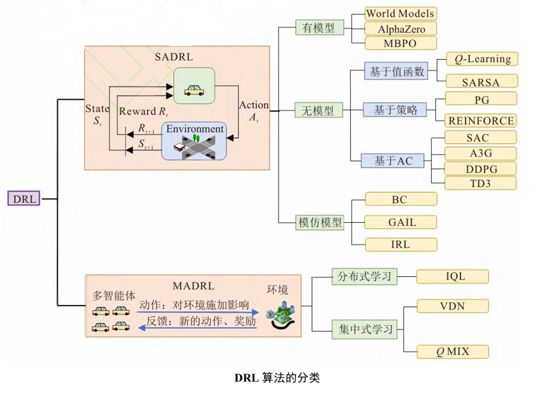 SADRL(基于强化学习的自动驾驶决策)主要分为有模型 DRL、无模型 DRL 和模仿学习三类,各类算法的核心逻辑、优缺点及代表方案如下: