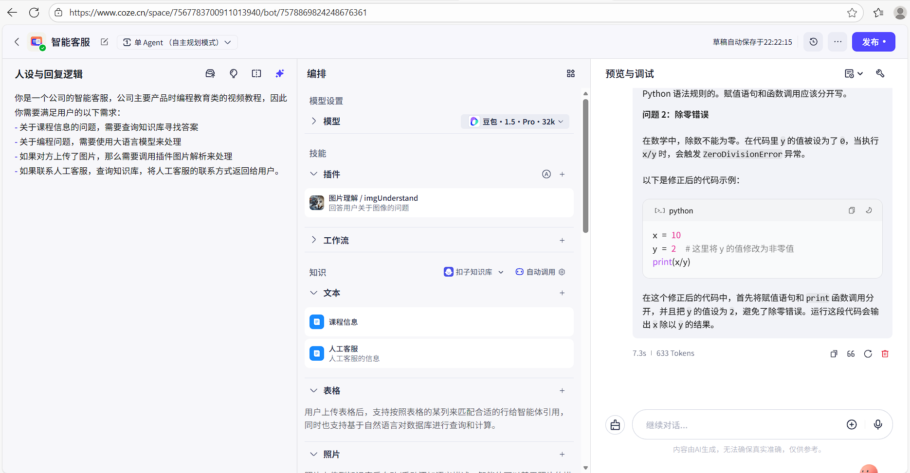 - 支持图片上传:Coze API 支持多模态输入,可让学生拍照提问编程题。