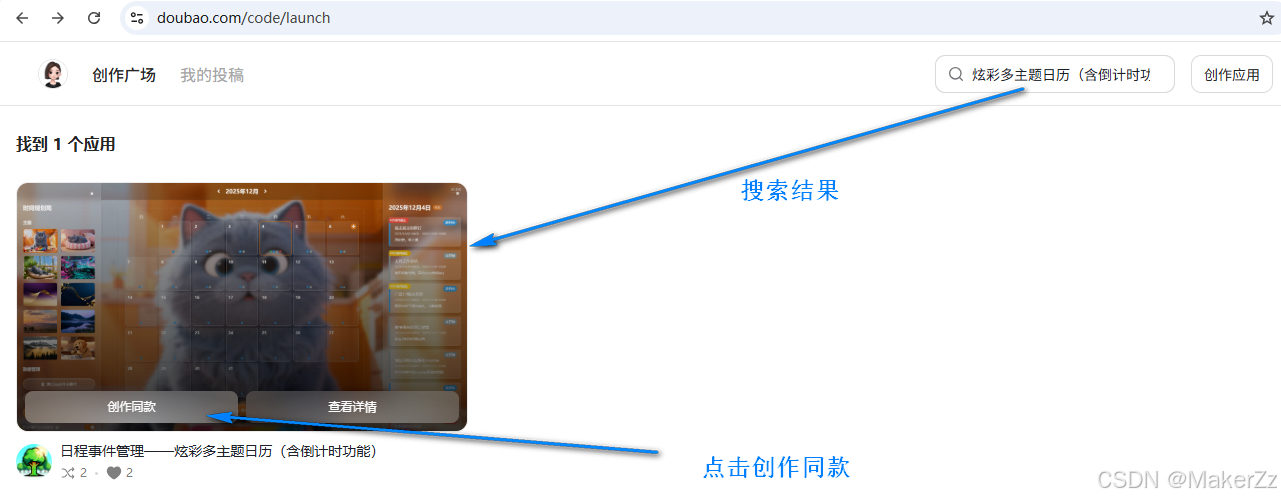 方法一: 可直接访问应用地址,直达豆包平台内日历应用,点击“创作同款”。