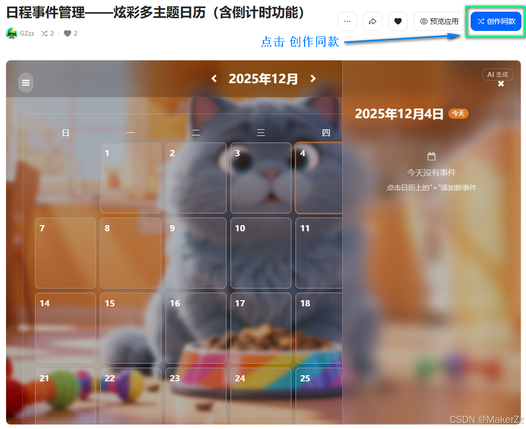 在创作广场右上角搜索框中搜索:日程事件管理——炫彩多主题日历(含倒计时功能)点击“创作同款”