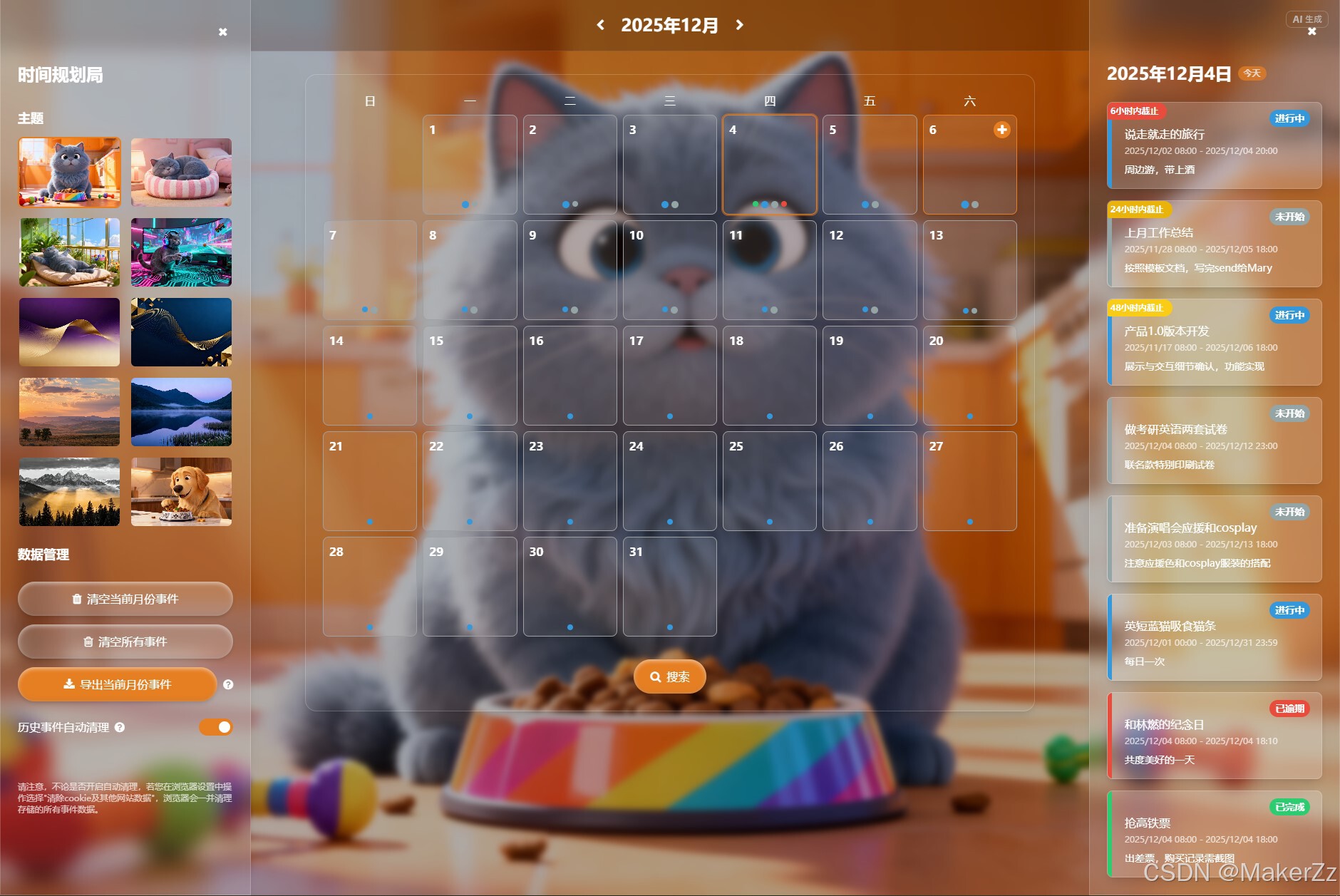 基于JS和HTML开发的日程管理工具应用,具备事件添加、编辑、删除、搜索及导出Excel功能。应用采用多主题设计,核心功能包括:1)日历展示与事件状态管理(未开始/进行中/已完成/已逾期);2)自动计算事件倒计时;3)事件搜索与导出;4)响应式布局适配不同屏幕。应用通过浏览器本地存储数据,提供自动清理选项。用户可通过豆包平台搜索:炫彩多主题日历(含倒计时功能);一键同款获取完整代码或参考提示词自行