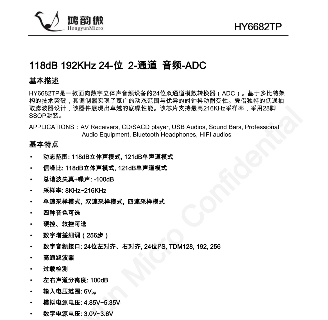 鸿韵微HY6682TP:专业音频ADC,直接替代TI PCM4202,高性能ADC,动态范围120dB