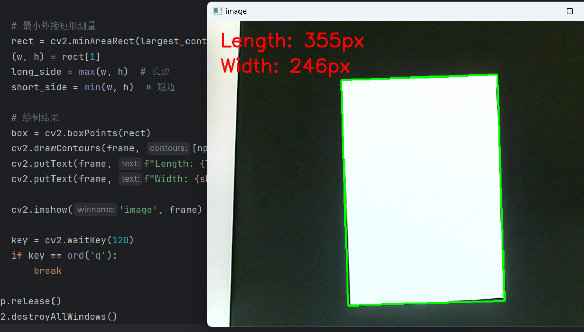 cv2.putText(frame, f"Length: {long_side:.0f}px", (20, 40), cv2.FONT_HERSHEY_SIMPLEX, 1, (0, 0, 255), 2)