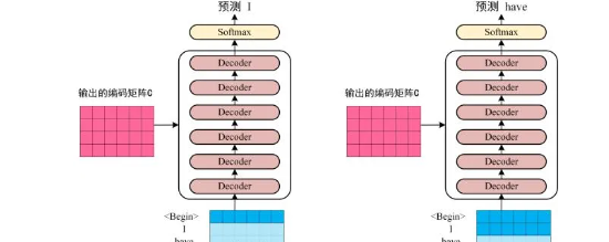 上图Decoder接收了Encoder的编码矩阵C,然后首先输入一个翻译开始符"<Begin>",预测第一个单词"I";然后输入翻译开始符"<Begin>"和单词"I",预测单词"have",以此类推。