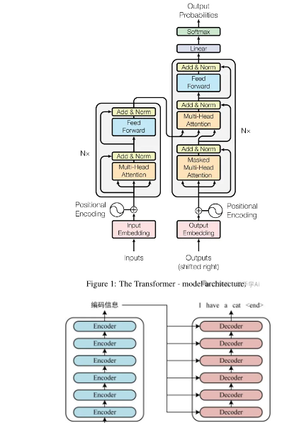 Transformer的内部结构图,左侧为Encoder block(编码器),右侧为Decoder block(解码器)。可以看到:
