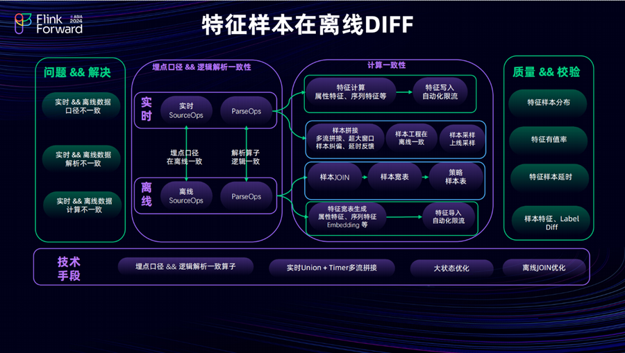接下来分析特征样本在离线 DIFF问题,这在我们内部是一个较为棘手的痛点。 DIFF 本质上可归结为三个方面:其一,实时与离线数据的口径可能不一致;其二,实时与离线数据的解析方式或许存在差异;其三,实时与离线数据的计算过程也不尽相同。