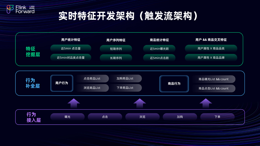 下面我们来看实时特征开发的架构,在我们内部,它被称作触发流架构。该架构将数据整体划分为三层: