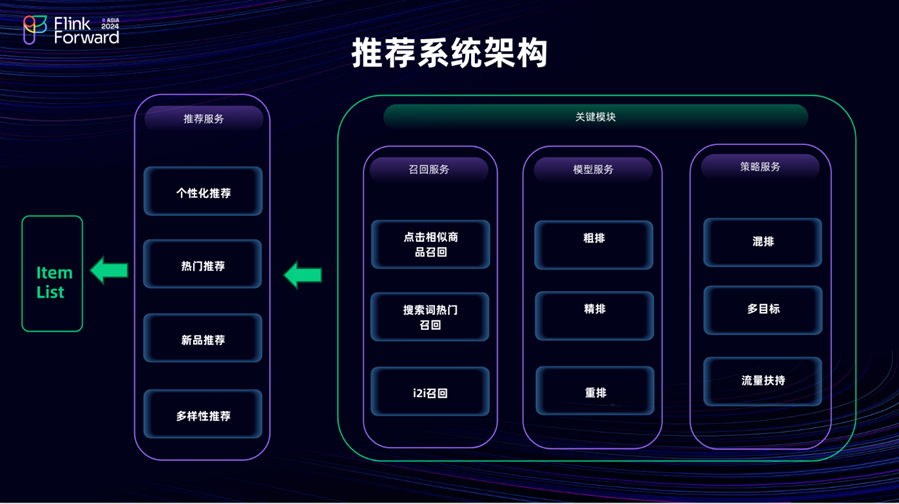 推荐系统通常包含推荐服务,这一服务提供了推荐系统的出口,基于此接口,能够实现多种推荐场景,如个性化推荐、热门推荐、新品推荐以及多样化推荐等。此外,我们关注的推荐系统的关键模块主要划分三个:召回模块、模型(粗排、精排、重排等)及策略。在召回及策略模块中,召回服务的作用是将推荐系统底池数据规模从亿或者百亿级别降低至千万级。
