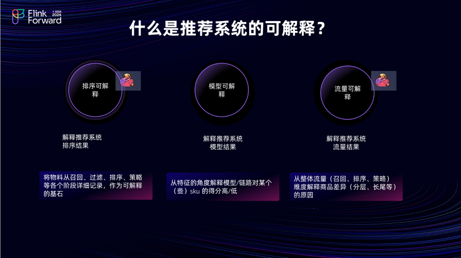 接下来,我们看看在可解释性方面的工作。首先介绍一下推荐系统可解释性的概念,它主要分为三个方面:排序可解释、模型可解释以及流量可解释,这是我们内部划分的三个研究方向。鉴于今天的分享聚焦于 Flink ,所以我们主要探讨与 Flink 相关的排序可解释和流量可解释。