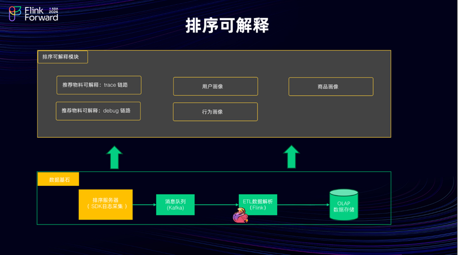 下面进一步详细介绍排序可解释。排序可解释主要由五个模块构成,分别是 Trace 链路、Debug 链路、用户画像、商品画像以及行为画像。 在这一过程中, Flink 发挥着关键作用,主要承担实时数据 ETL ( Extract,Transform,Load,即数据提取、转换和加载)功能。对于数据基石部分,我们会在排序服务器上部署 SDK 。该 SDK 能够将日志采集到消息队列中,而后续在进行 ETL时,则借助 Flink 来实现。值得一提的是,通过 Flink 的处理,数据能够做到实时入仓,且这一过程的延迟时间大约在秒级,确保了数据的高效处理与及时存储。