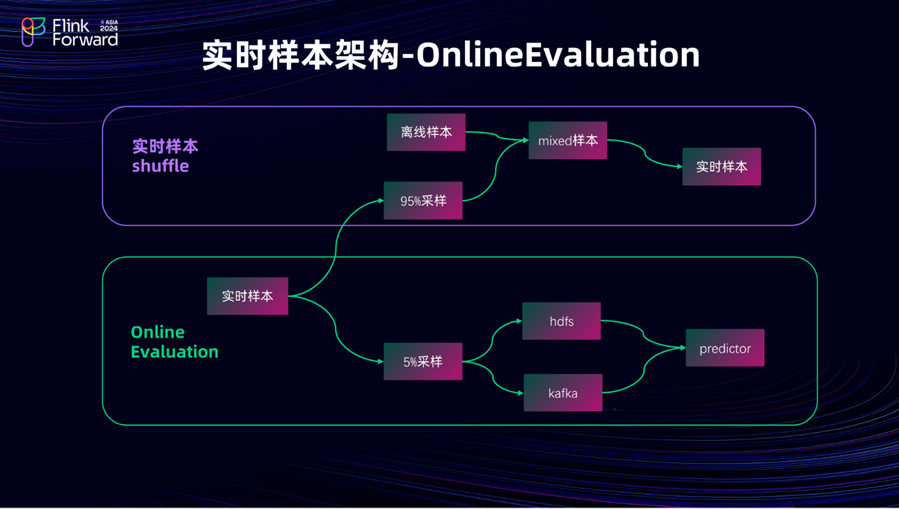 下面我们来看实时样本的 Online Evaluation 模块,该模块主要应用于模型评估场景。实时样本的情况与上页 PPT 结尾部分大致相似,但在此过程中会涉及采样策略。在上页 PPT 结尾,我们提到将数据全部发送至Kafka,而实际操作中,我们会对数据进行95%和5%的采样。其中,95%的数据用于模型训练,5%的数据用于评估(Evaluation)。 在评估环节,又细分为实时评估与离线评估。之所以如此划分,是因为离线评估虽然不够实时,但实时评估在一定程度上无法起到全面指导的作用(实时评估有三种标签)。为综合两者优势,我们将评估工作分为离线和实时两部分,在进行离线评估时,只有当模型的 AUC 达到预先配置的数值,才会将模型推向线上应用;若未达到该数值,模型将立即重新进行训练。而在实时评估过程中,我们会持续监控模型数据,一旦模型准确率下降,系统便会马上发出警报,同时考虑是否需要对模型进行回滚操作。