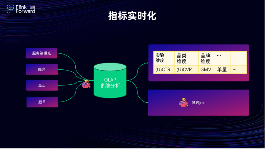 下面我们来关注指标方面的内容。在推荐系统里, Flink 主要实现了指标的实时化维度。整个指标体系的构建,是先通过 Flink 将埋点数据导入 OLAP 系统,基于这些数据,我们能够从多个维度展开指标分析,例如,从实验维度、品牌品类维度等,所计算的指标丰富多样,涵盖 UCTR、UCVR、GMV、单量以及流动性等关键指标。大家不难发现,有些指标单纯依靠 OLAP 进行计算,可能会面临困难,以典型的 OLAP 系统 Click House 为例,当进行多表 Join 操作时,其性能会明显下降。所以,为了准确且高效地计算各类指标,除了 OLAP,我们还会借助 Flink 来完成其他指标的计算工作。