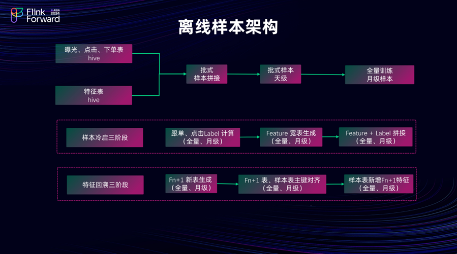 这里我们主要介绍下离线样本拼接,接下来我们看样本的离线架构,它与前文提及的架构大致相似,主要操作是将用户行为的离线label表与离线特征表进行批式拼接,进而生成天级样本表,随着日复一日的积累,这些天级样本表会形成月级样本,以此便可开展全量训练。然而,在此过程中会出现一些问题。例如,在全新的业务场景下,可能初始并无可用样本,此时就需要将诸如订单、点击等标签( Label )的计算工作全部重新计算;此外,完成这部分操作后,还可能涉及生成特征(Feature )宽表,这同样是基于全量数据且以月级为周期的特征处理,在进行这些数据计算和关联( Join )操作时,对算力的要求极高。