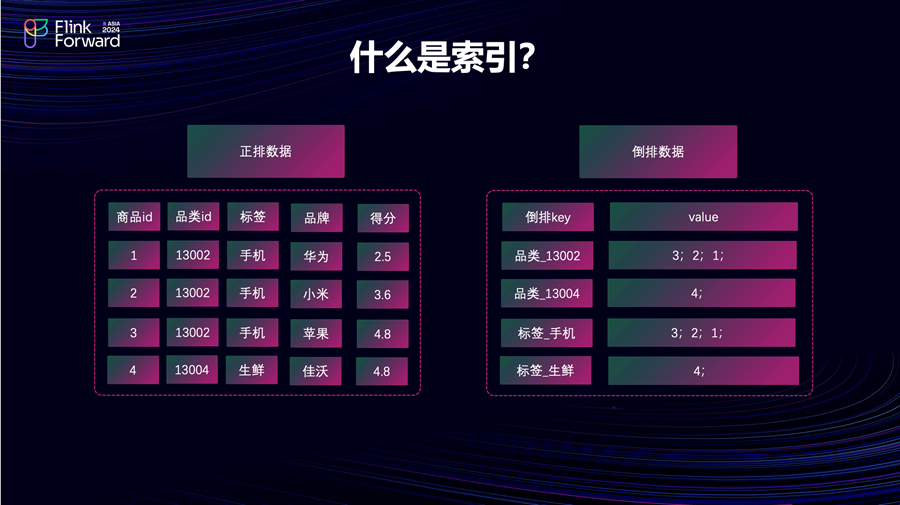 接下来介绍一下什么是索引数据,索引数据主要分为正排数据与倒排数据,正排数据,本质上是将商品的各项属性依次排列,这也是大家通常所指的正排形式;倒排数据,则是依据属性信息,把相应的商品作列表作为值进行存储。