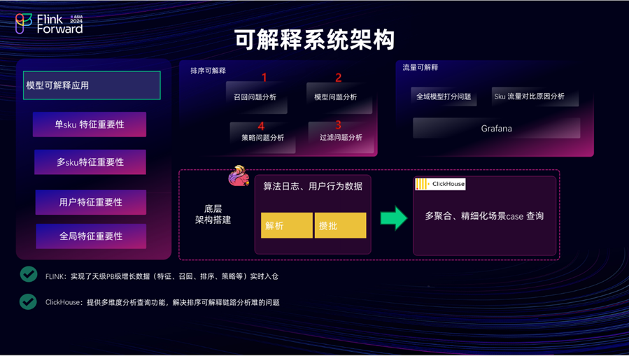 重点来看右侧底层的搭建。我们将用户的算法日志以及用户行为数据进行解析与展开处理后,写入 ClickHouse(CK)中。借助CK 强大的功能,我们能够进行多维度聚合操作,以及针对精细化场景案例的查询。例如,分析为何在情人节时系统会向用户推送丧葬用品类的鲜花。 在排序可解释方面,主要涉及一些常见场景的分析。比如,当用户发现某些商品未得到曝光时,通过排查若发现商品未被召回,就需要进一步分析是否应增加一路召回途径,或者检查某路召回是否出现故障。对于模型而言,若某个模型一直表现稳定,但突然某项得分持续下降,就需判断是否是模型本身出现了问题。针对策略方面,要分析策略是否存在问题,或者优势体现在何处。还有过滤环节,像曝光过滤的设置是否合理等,都能通过可解释系统进行深入分析。 流量可解释主要从两个方向展开。其一,全域的模型打分问题,即分析模型给出的分数是否合理。其二,SKU 流量对比的原因分析,例如,某些 SKU 的流量获取能力较强,像新发布的苹果17,其流量通常会高于新上架的普通苹果产品(这里所举例子虽较为极端,但旨在说明问题),我们可以从召回、模型、策略、过滤等多个维度全面分析此类问题,在这个架构中,Flink 发挥了重要作用,它实现了数据以天级为单位的 PB 级增长,并能做到实时入仓。而 Click House则为我们提供了多维分析的查询功能,有效解决了排序可解释分析过程中面临的困难。