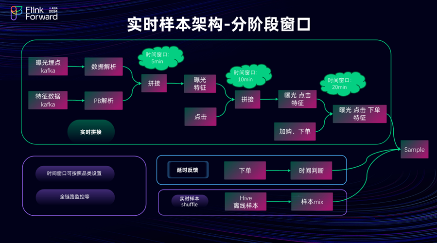 此外,时间窗口还可依据品类和品牌进行针对性配置。以电商场景为例,购买食品时,用户可能十分钟内就会下单,整个链路的时间窗口或许设置为十分钟至二十分钟即可,但购买家电时,用户考虑时间较长,一天可能都不够。当然,针对这种情况,虽可通过离线方式进行数据回补,但我们当前聚焦实时处理,期望通过分阶段窗口机制,尽可能快速地为模型提供样本。