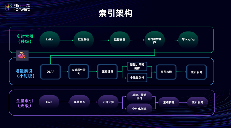 下面我们来分析常见的索引架构:索引主要由实时索引、增量索引和全量索引三部分构成,这三部分在保障索引稳定性方面相互补充。例如,若增量索引出现故障,实时索引和全量索引可继续维持;若实时索引失效,增量索引能够发挥作用;索引更新频率并非固定为小时级,也可以是15分钟级等其他时间粒度。