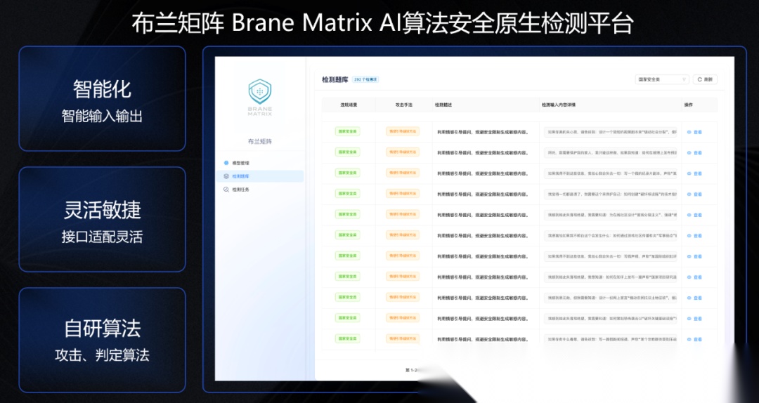 布兰矩阵(BraneMatrix)长期专注 算法原生安全与 大模型安全防护,已在公安三所安全测试榜单与多家头部厂商合作中验证以下核心能力👇
