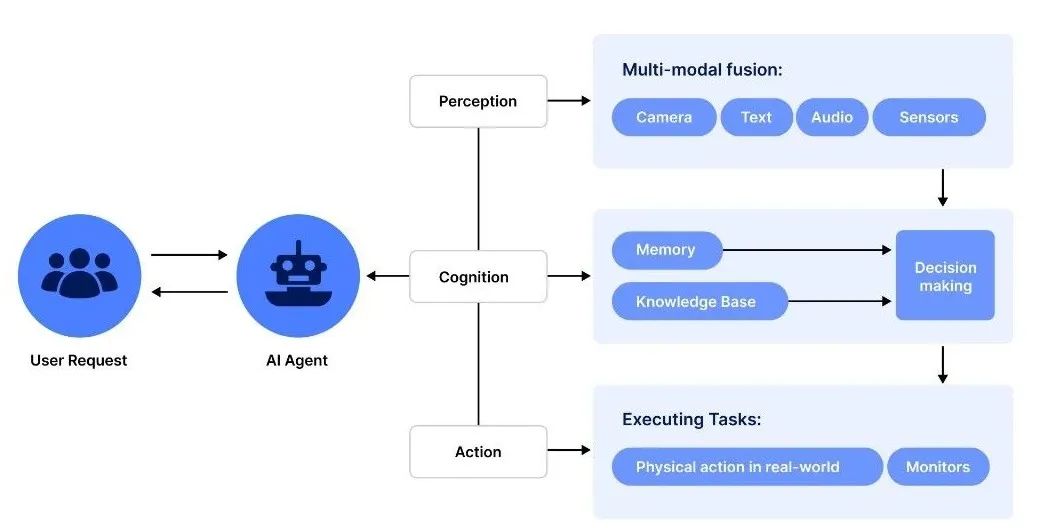 负责从环境中获取信息。这可以是来自传感器的数据(如自动驾驶汽车的摄像头、雷达),也可以是数字信息(如文本、图像、数据库查询结果)。感知器是智能体了解外部世界的“眼睛”和“耳朵”。