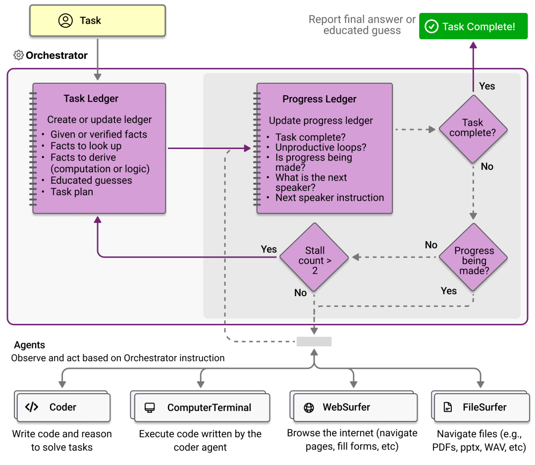 | Magentic-One | 通用多智能体系统:Orchestrator协调专业智能体,处理开放式网络和文件任务。 | 企业自动化、数据分析、信息检索、需要AI驱动多个助手协同工作的复杂任务。 |