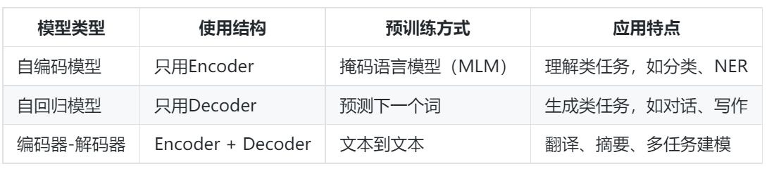 📍Transformer结构可以根据任务需求灵活裁剪或组合,其在预训练模型中的三种主要使用方式如下: