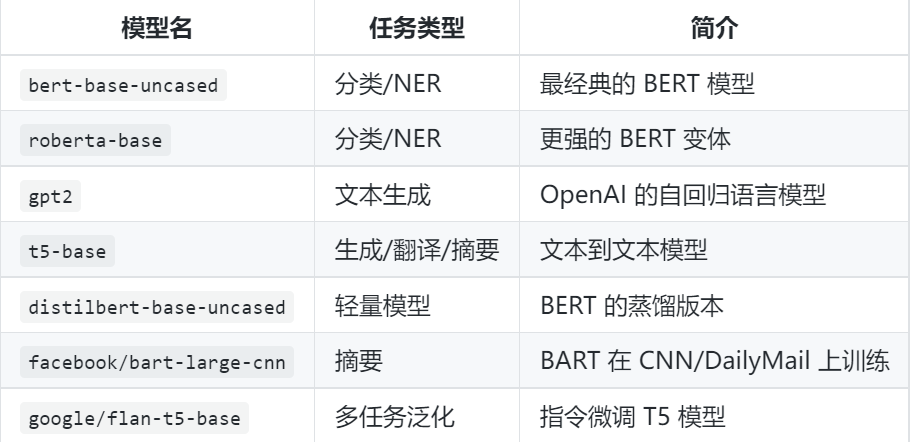 sentiment-analysistext-classificationquestion-answeringtranslationtext-generationsummarizationtoken-classification(如命名实体识别)