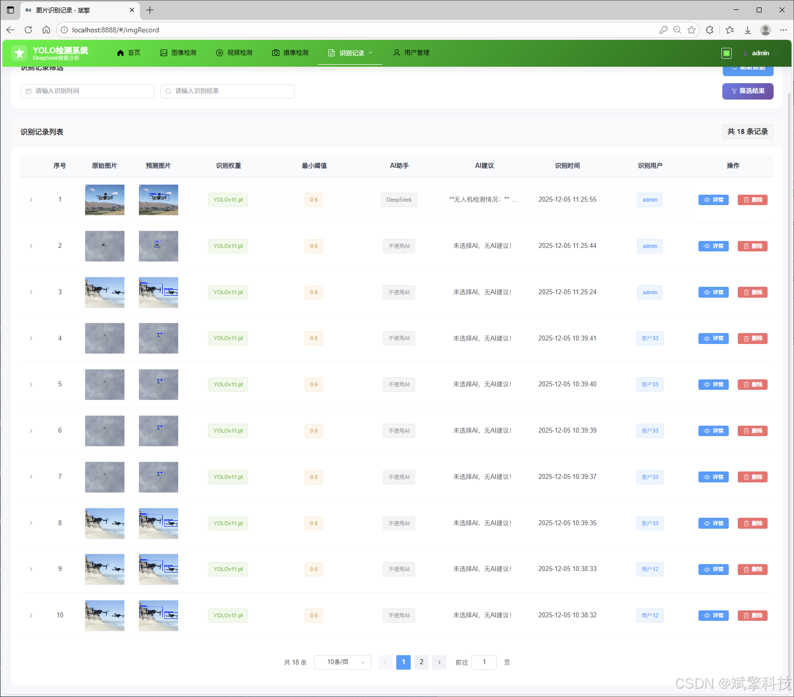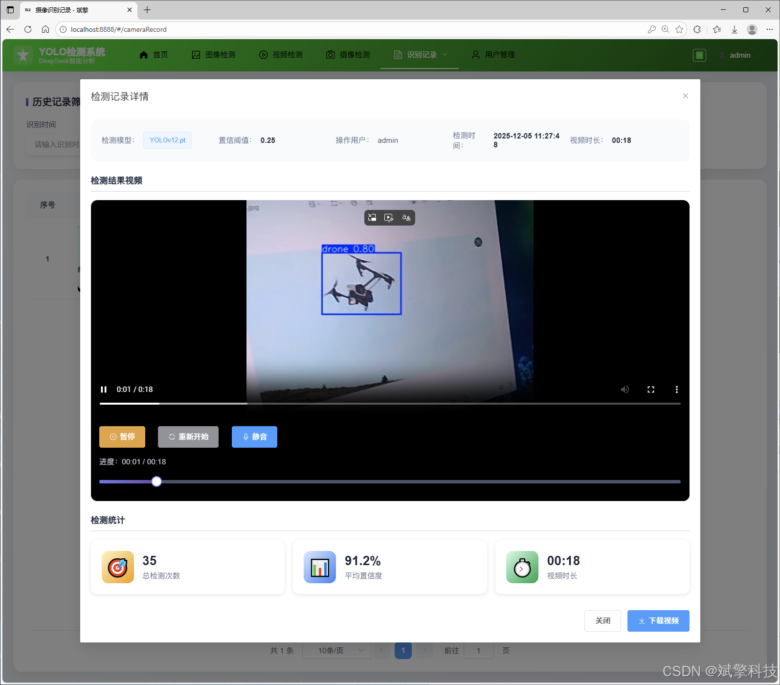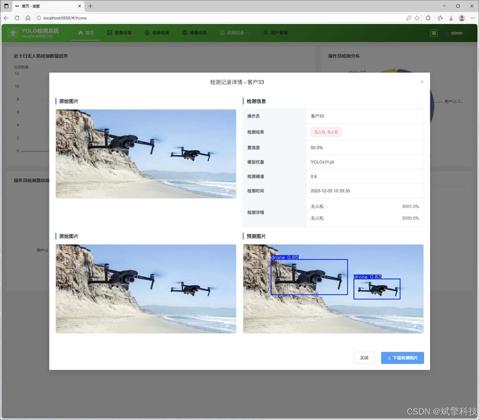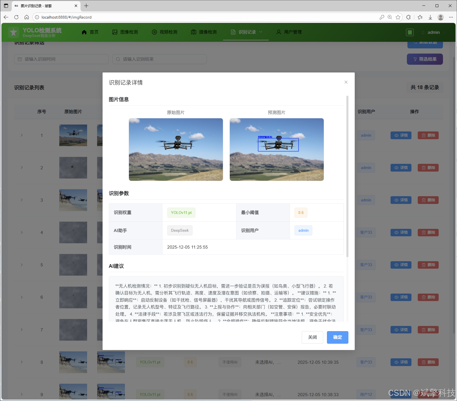 结果持久化: 每一次检测任务的元数据(时间、用户、模型、文件路径)和结果(检测到的无人机数量、置信度)都自动保存至MySQL数据库,形成历史记录。