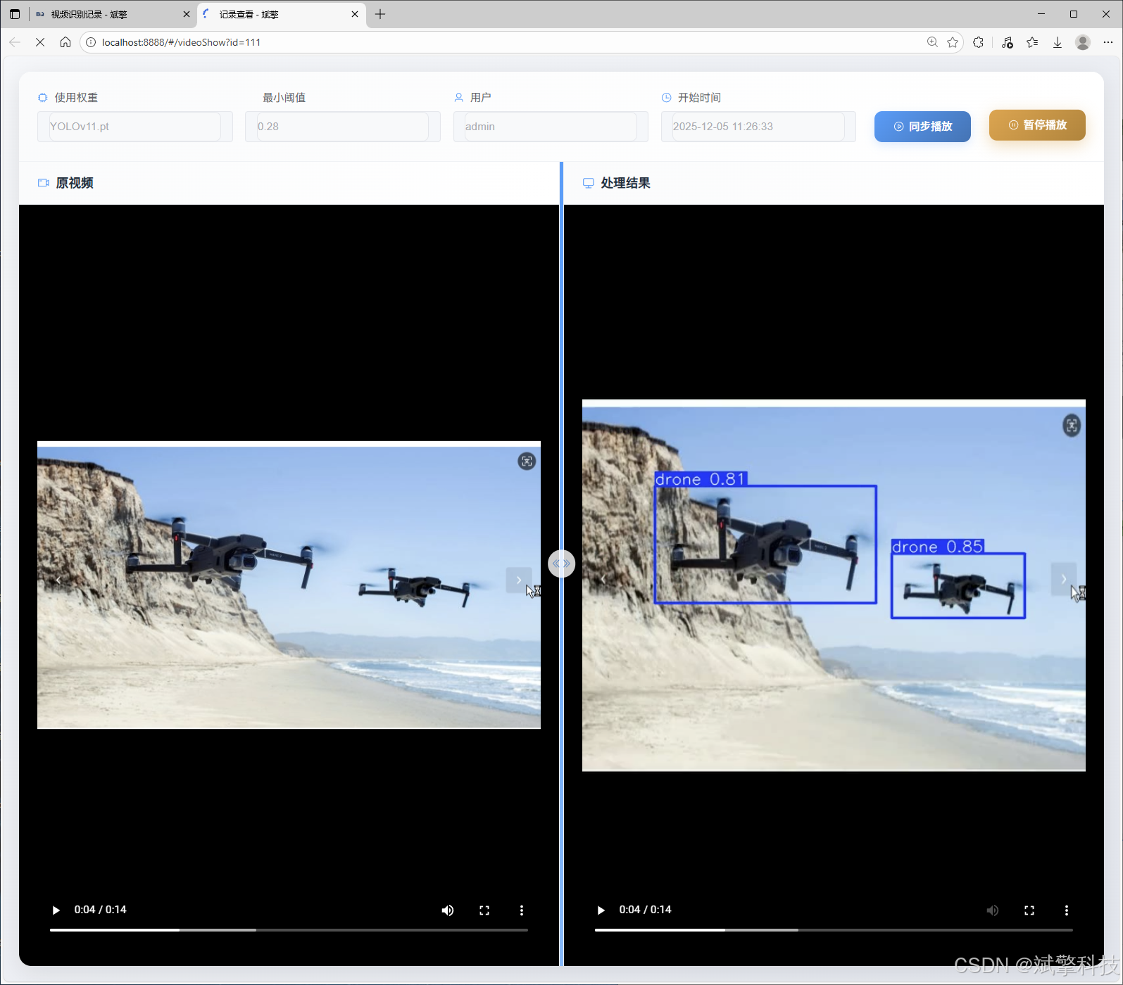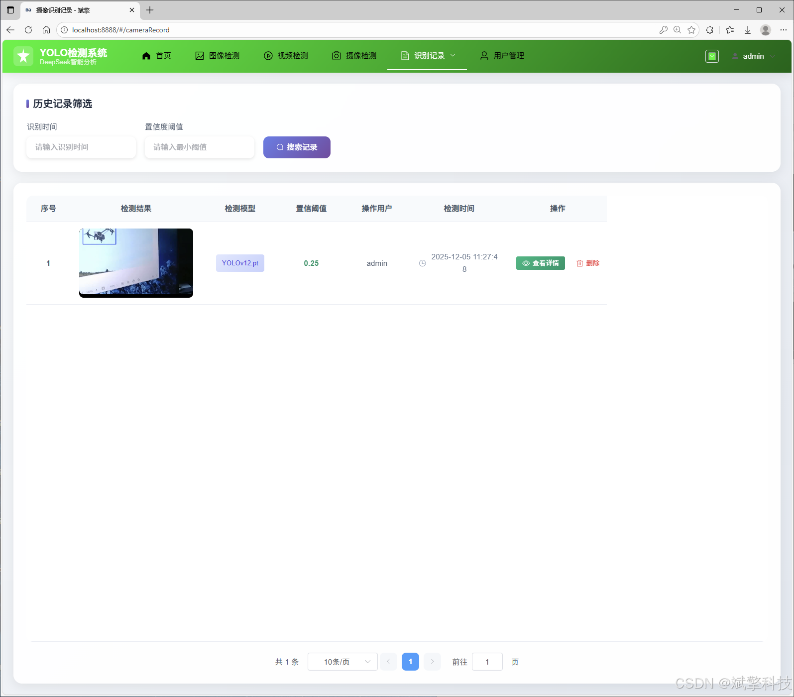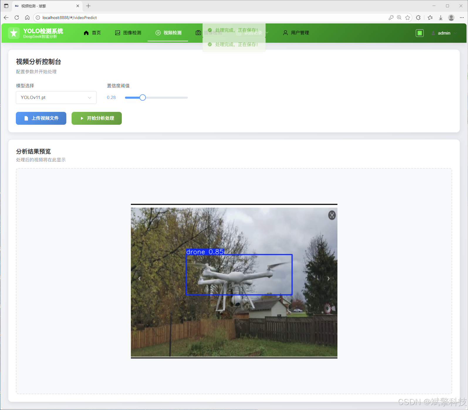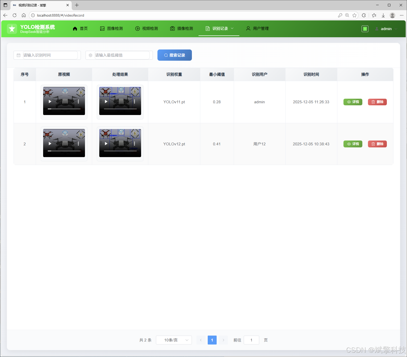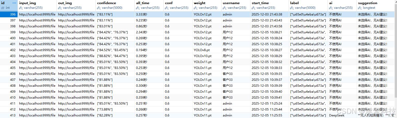 结果持久化: 每一次检测任务的元数据(时间、用户、模型、文件路径)和结果(检测到的无人机数量、置信度)都自动保存至MySQL数据库,形成历史记录。