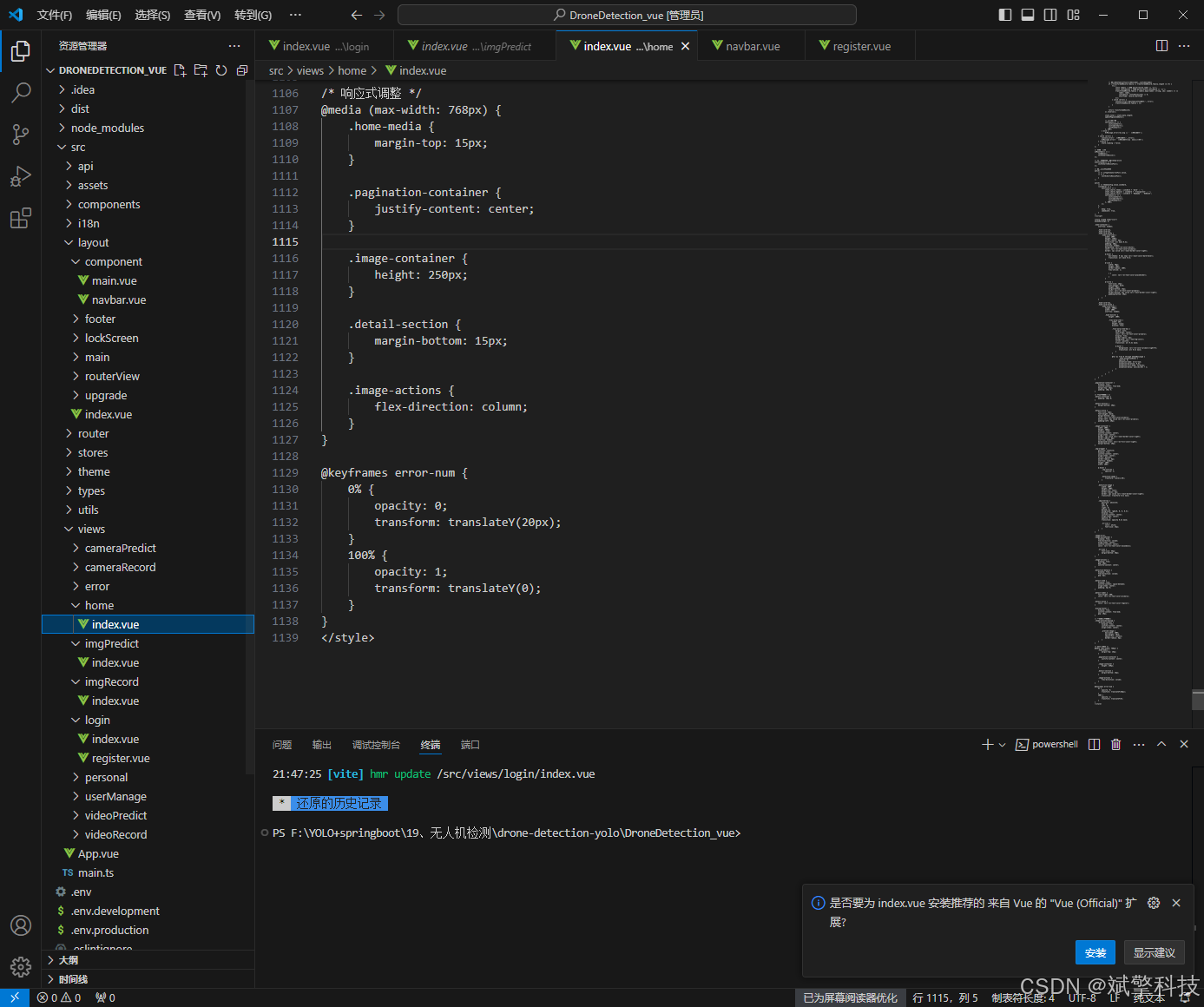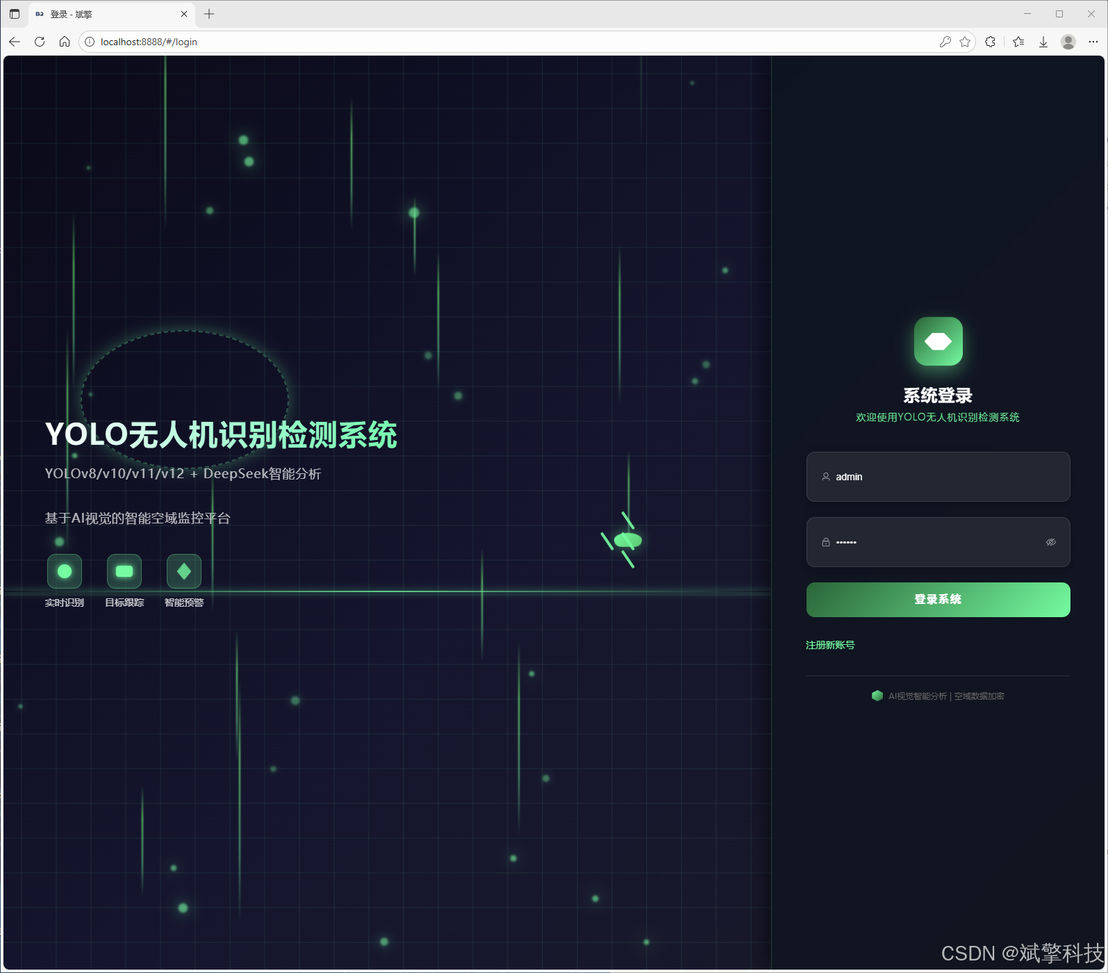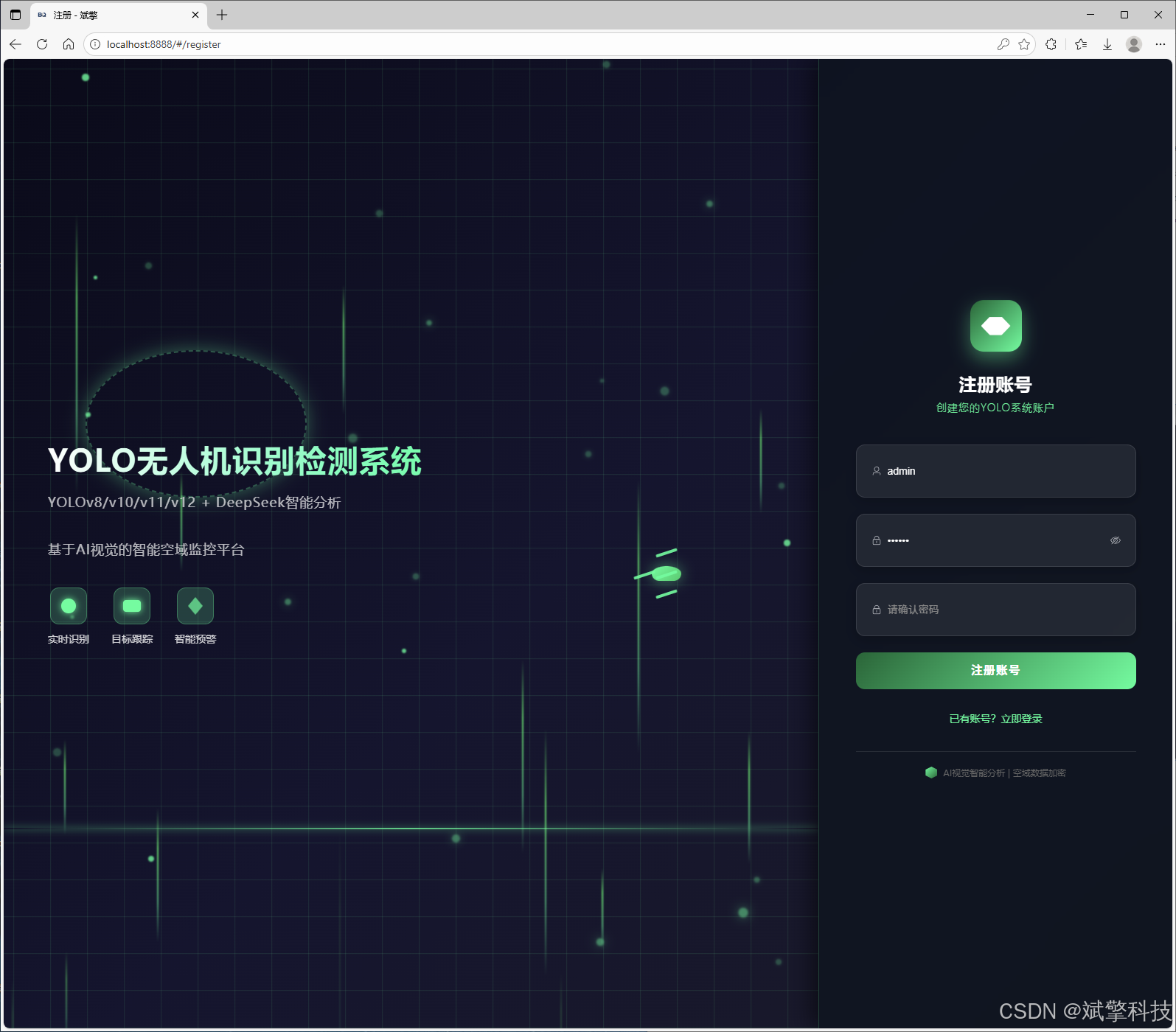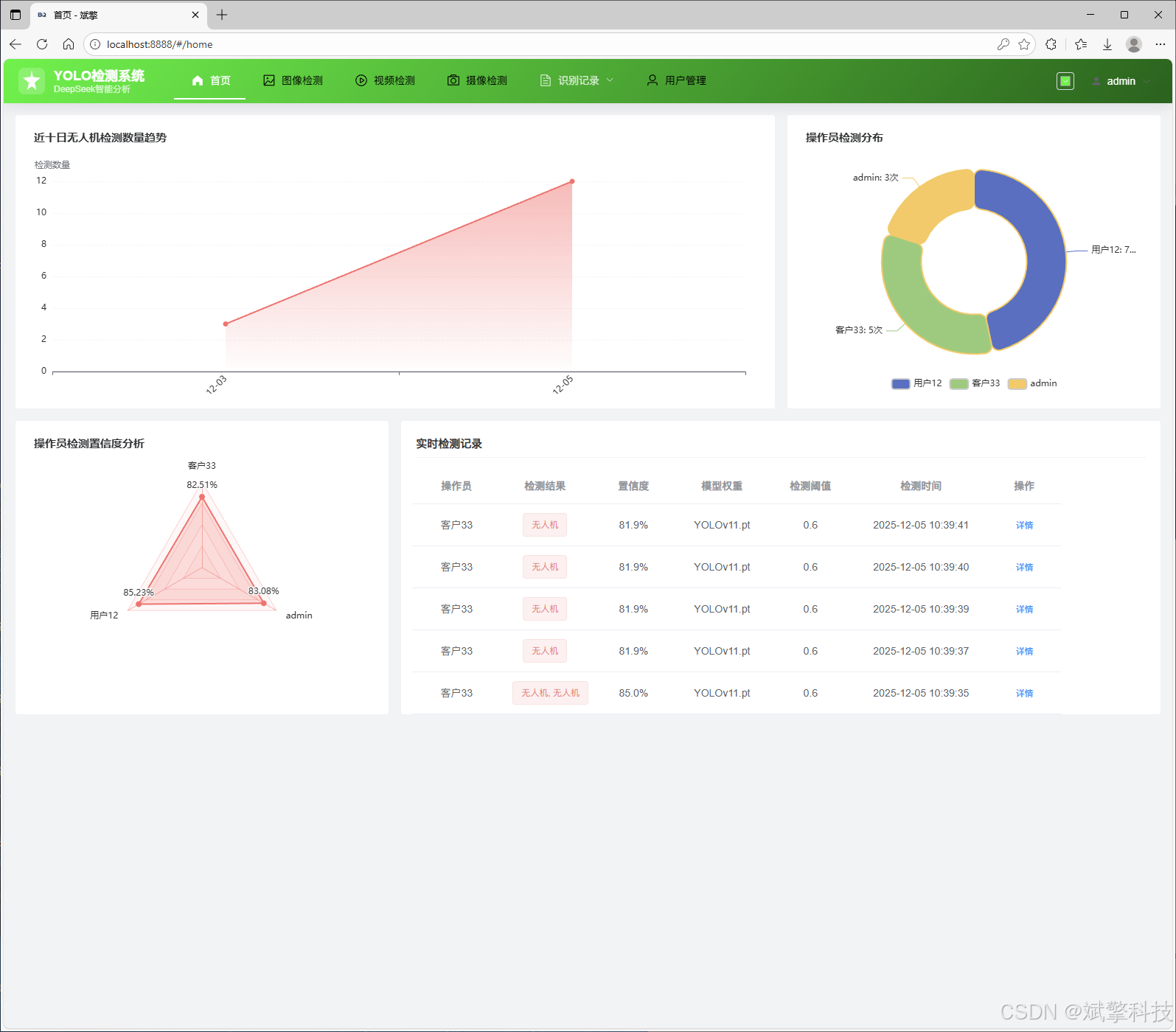 本项目旨在设计并实现一个高效、精准、用户友好的无人机自动识别与综合管理系统。系统核心采用当前最前沿的YOLOv8/YOLOv10/YOLOv11/YOLOv12目标检测算法,构建了一个高性能的无人机检测模型。项目创新性地集成了DeepSeek大型语言模型的智能分析能力,赋予系统对检测结果的语义理解和生成式描述功能。系统架构采用前后端分离的现代化设计模式,后端使用Spring Boot等框架构建稳健的API服务,前端采用Vue.js构建响应式、高交互的Web界面,确保了良好的可维护性和扩展性。系统功能全面,不仅支持图像、视频、摄像头实时流的无人机检测,并将所有检测记录与用户行为数据持久化存储至MySQL数据库,还提供了完善的用户权限管理、可视化数据分析、多媒体记录管理等后台模块。本系统将深度学习的前沿技术、大模型的智能分析与成熟的软件工程实践相结合,为无人机监管、空域安全、反制系统等领域提供了一个功能强大、界面直观的一体化解决方案。