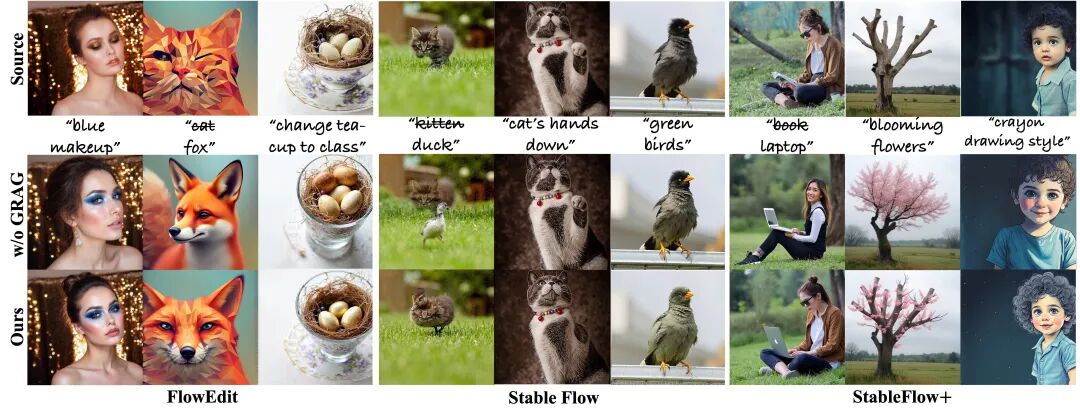 GRAG不仅适配Kontext、Qwen-Edit、Step1X-Edit等训练型模型,还能用于Flowedit、Stableflow等“免训练”Diffusion编辑器,实现跨模型通用性。