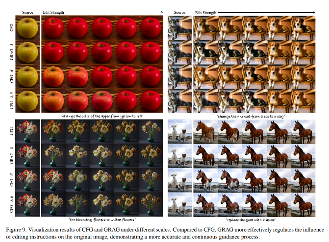 CFG与GRAG在不同强度下的编辑对比。GRAG能实现连续且线性的编辑效果,细节过渡自然;而CFG调整下结果跳变明显,难以实现平滑强度调节。